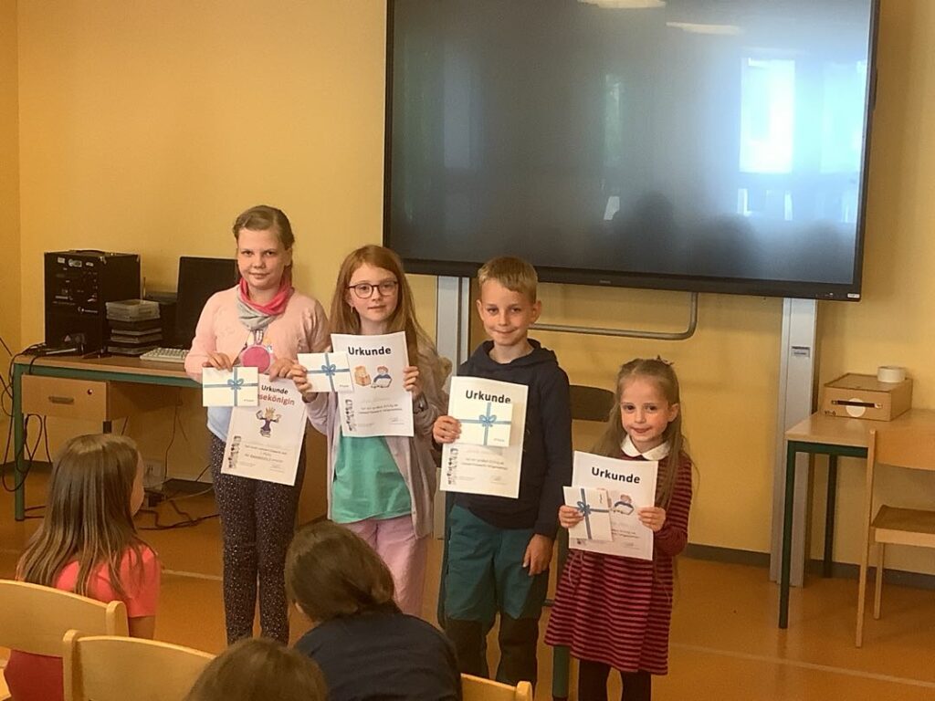 Beim diesjährigen schulinternen Lesewettbewerb konnten sich Publikum und Jury davon überzeugen, dass alle ausgewählten Kinder hervorragend gelesen haben. Entsprechend schwer war es für die Jury, die aus zwei ehemaligen Lehrerinnen und je zwei Regelschüler/innen bestand, die Allerbesten zu finden, um sie zu Lesekönig oder Lesekönigin zu machen. Doch nun ist die Entscheidung gefallen: