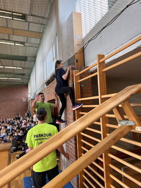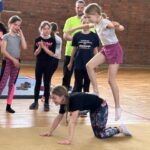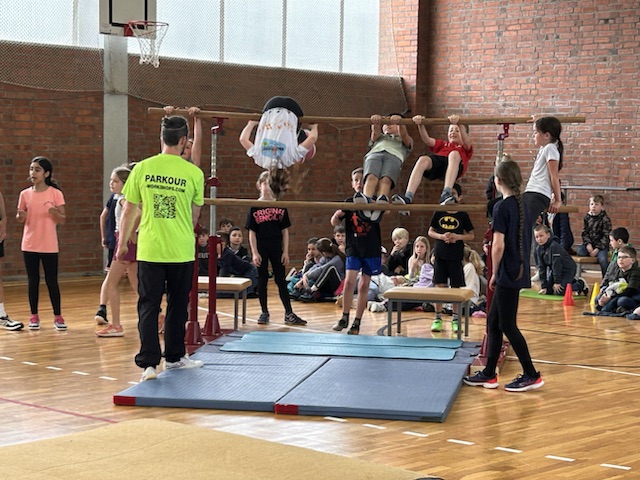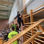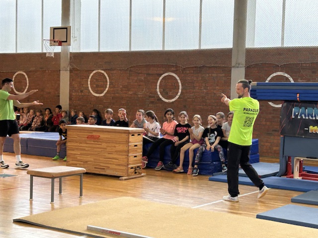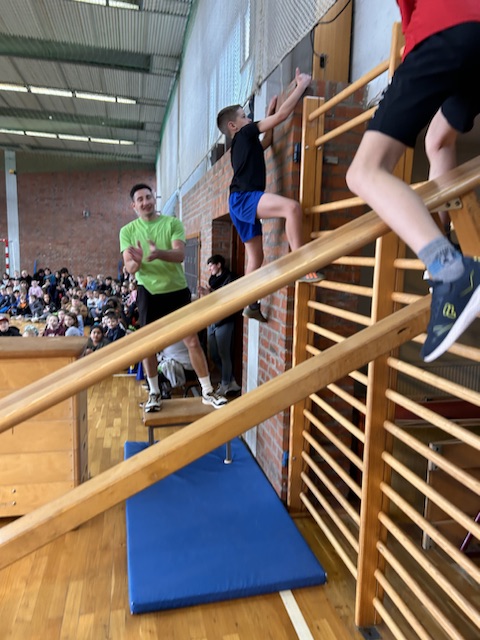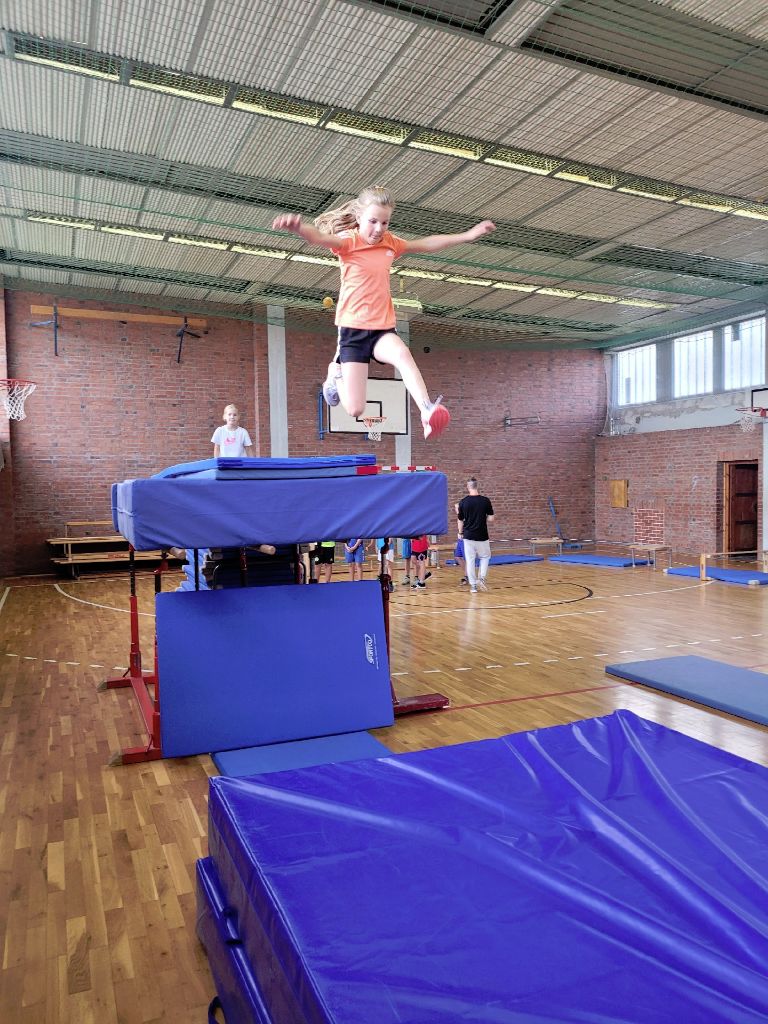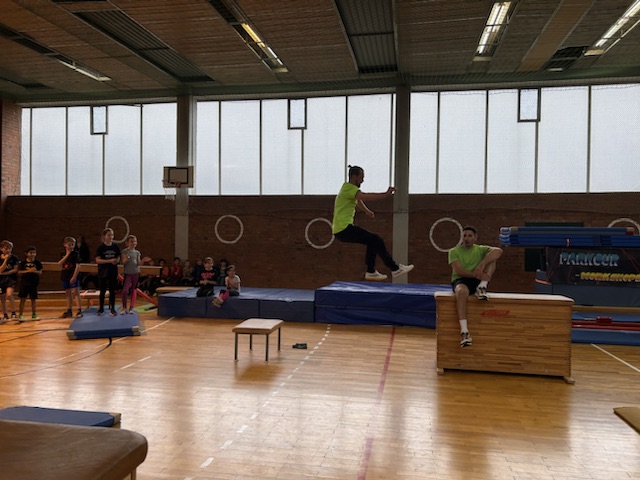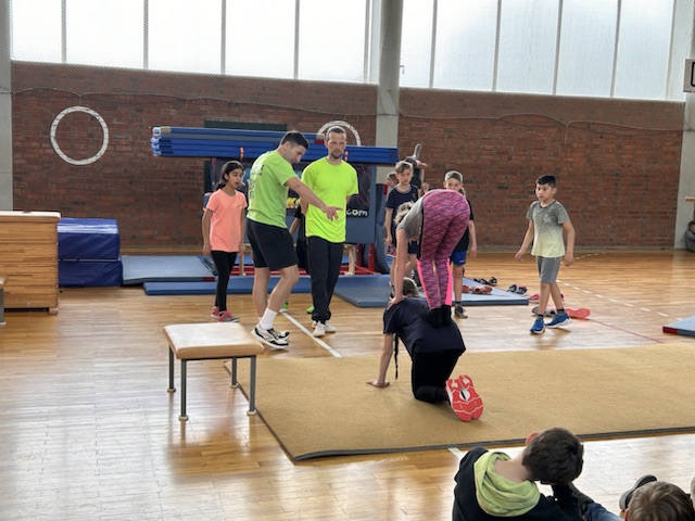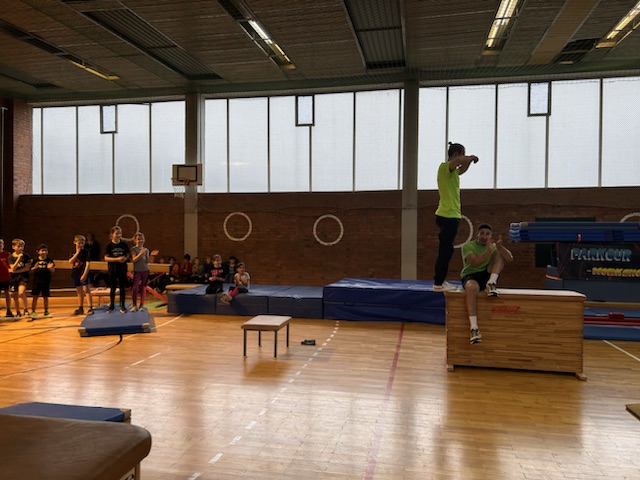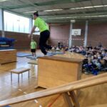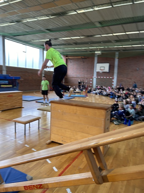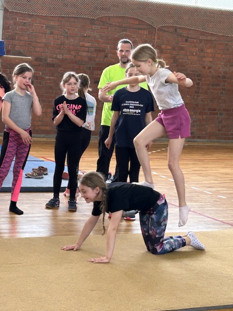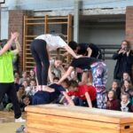 Im Rahmen des Landesaktionsprogramms „Stärken-Unterstützen-Abholen“ fanden an unserer Schule in diesem Schuljahr mehrere intensive Workshops statt. Während sich die eine Hälfte einer Klasse bei unserem Ernährungs-Coach Luise Schikore mit gesunden und ausgeglichenen Maßnahmen beschäftigte und spielerische Anregungen für den Alltag bekam, übte die andere Hälft mit Frank Fleischmann und Manu Jäger Sprünge, die sich die Kinder bisher so noch nicht zugetraut hatten. Weiter und höher geht es, so erfurhen die Kinder, mit Konzentration, Körperspannung und Selbstvertrauen. Eine Gruppe aus Viertklässlern zeigte beim fuminanten Abschluss, was alles möglich ist, wenn man sich (ver-)traut.