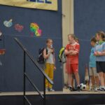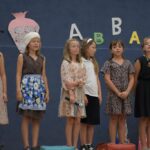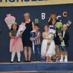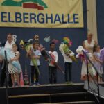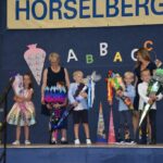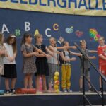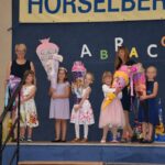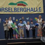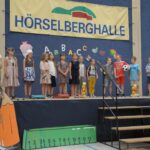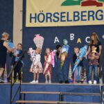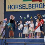 Danach gab es die sehnlich erwarteten Zuckertüten. Lehrer/innen der Schule halfen beim Auf- und Abstieg zur Bühne in der festlich geschmückten Hörselberghalle. Die insgesamt 58 neuen Schulkinder antworteten auf die Frage, worauf sie sich am meisten freuen, mit „Lesen, Schreiben, Rechnen, Singen und Basteln“ – und das geht nun los.