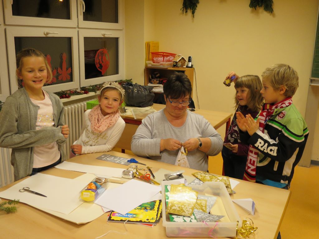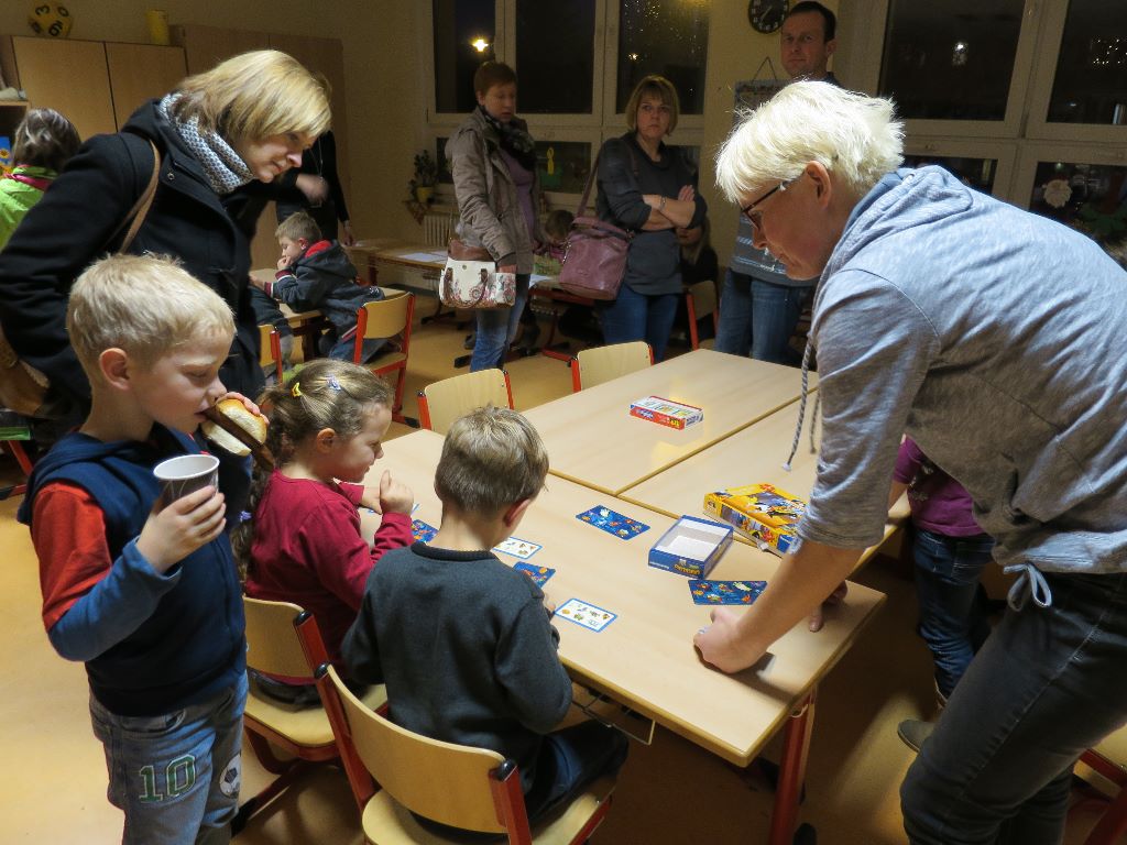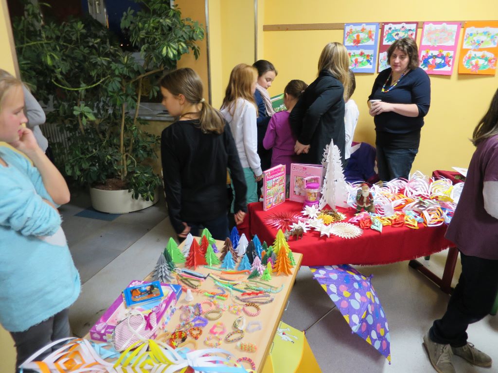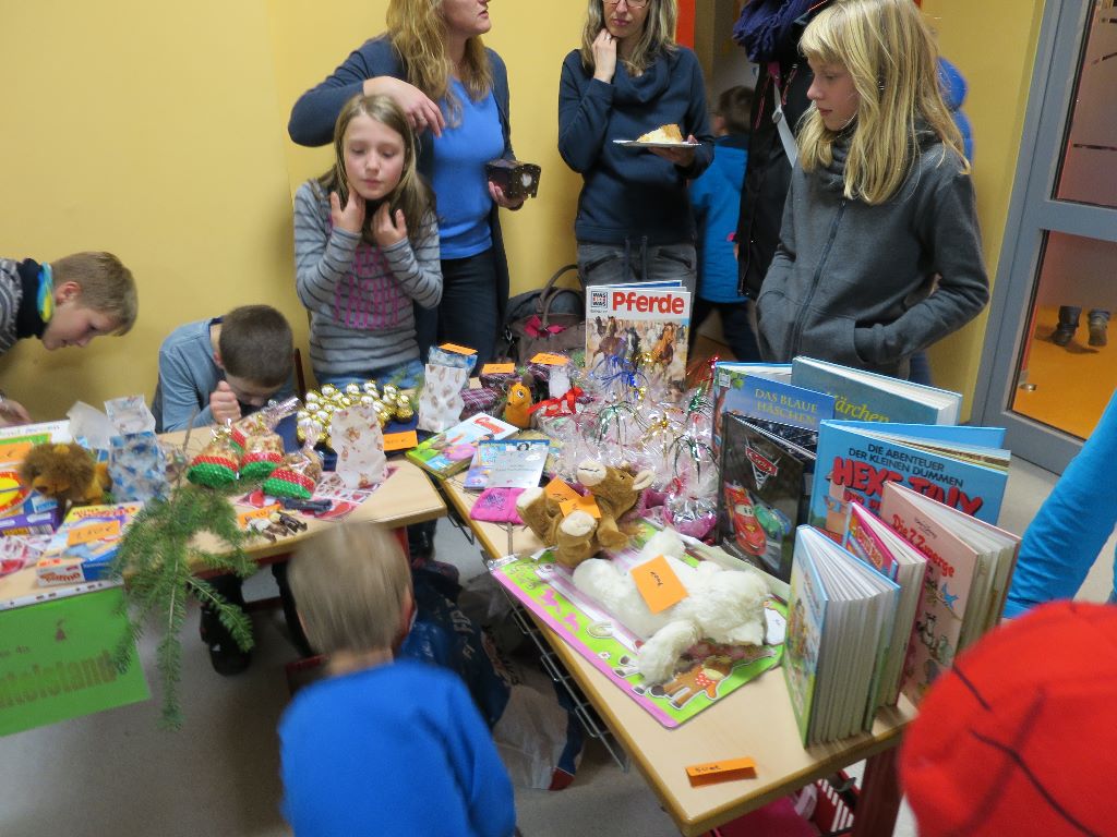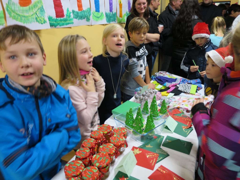Beim Weihnachtsmarkt in der Grundschule wurde am Freitag trotz Regenwetter in bester Weihnachtsstimmung gefeiert. Zunächst brachten die Klassen 2a und 2b die Gäste mit Großpapa Erwin (Philipp Hornaff) und Großmutter Mariannchen (Lisann Bätzel), die sich mit Liedern und Gedichten an frühere Weihnachten erinnerten, in Stimmung. Danach konnten an den zahlreichen Ständen der einzelnen Klassen hübsche Weihnachtsgeschenke oder begehrte Flohmarktschnäppchen erstanden werden. Auch die Stationen zum Basteln und Spielen wurden sehr gut angenommen. Für die kulinarischen Genüsse war mit einem riesigen Kuchenangebot und den wie immer schmackhaften Bratwürsten vom Förderverein bestens gesorgt. Die Schule bedankt sich herzlich bei allen Beteiligten!