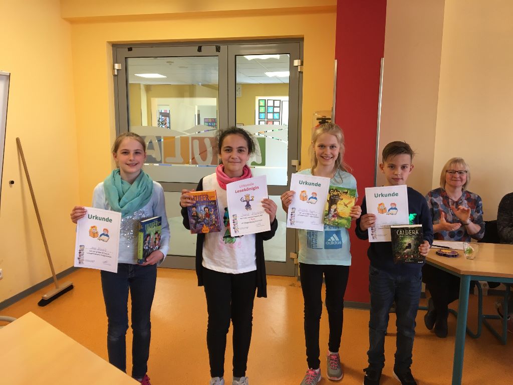 Lesekinder Klasse 4: Elisabeth Prager (4a), Oskar Meinig (4a), Anne Kämnitz (4b), Samar Maghames (4b)